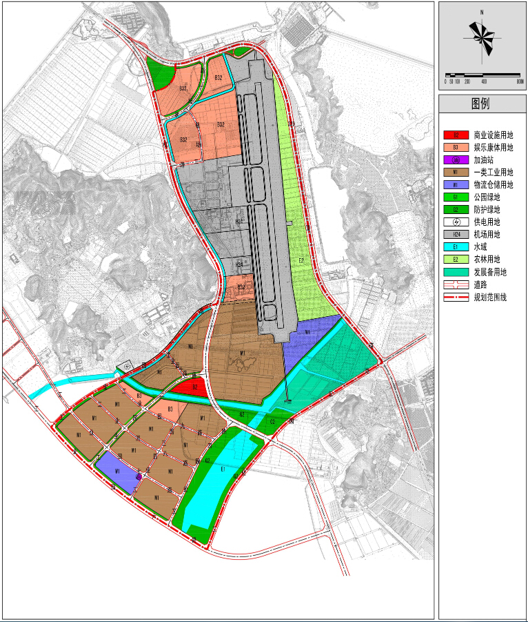 總體布局:該片區總體上形成“兩核兩帶”的規劃結構。兩核為航空運營核心和航空制造核心,兩帶為產業發展帶和生態綠帶。